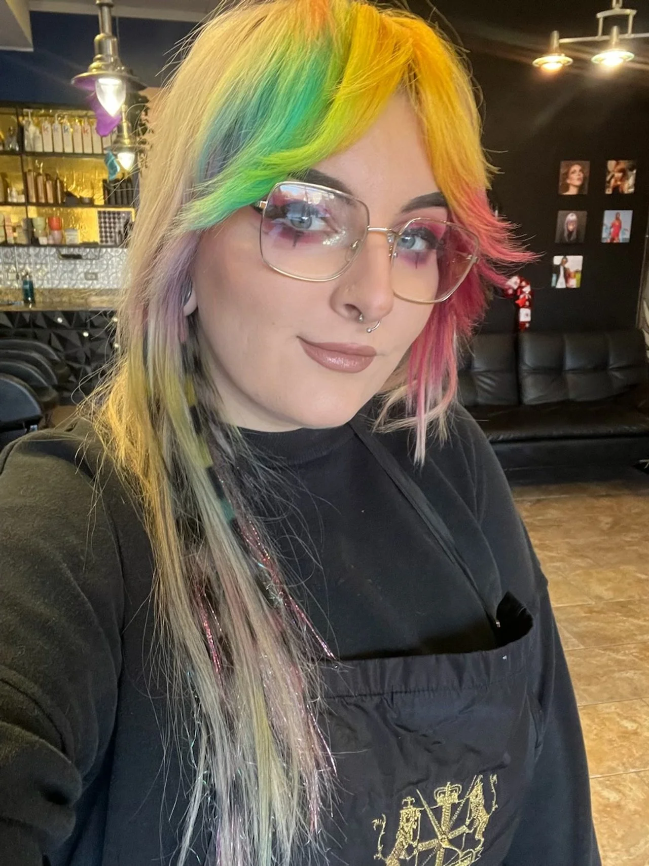 Some of her favorite things to do hair-wise are Shags, Mullets, and fun funky colors that let out the inner emo. She also takes lots of inspiration from Japanese fashion and trends. If you grew up loving FRUiTS magazine and the harajuku fashion scene, she’s your girl. Most of all, she strives to make people smile when they look in the mirror. Whether that be a gender affirming cut, a fun sorbet of color, or a classic long layered cut. If it gives someone the confidence and joy, she knows she’s done her job right.